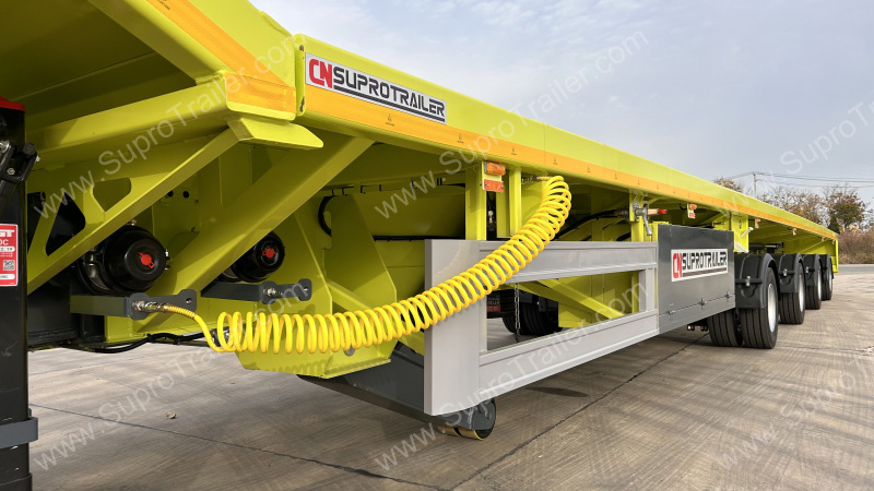 ❐ "Easy Supro" – ¡El nuevo remolque extensible para el transporte de cuchillas con dirección automática de Supro Trailer! Hemos integrado componentes con bisagra para almacenar el cableado eléctrico y las mangueras hidráulicas dentro de la viga extensible, lo que hace que el proceso de extensión y retracción sea más suave y eficiente. Además, el cuello de ganso es 260 mm más alto en comparación con la plataforma trasera de carga, aumentando el espacio entre la cuchilla y la viga extensible. Este despeje adicional asegura que, al conducir por caminos irregulares, el movimiento vertical de la viga extensible no impactará la parte inferior de la cuchilla. También hemos diseñado almohadillas espaciadoras especializadas para llenar el espacio entre la viga extensible y la funda, minimizando el balanceo de la viga y mejorando la seguridad del transporte de cuchillas. ❐ Supro Trailer también ha optimizado la apariencia del vehículo y mejorado los detalles de diseño, como la disposición y organización de las válvulas operativas, lo que facilita la operación y eleva la estética general del vehículo. Esta actualización no solo mejora el atractivo visual del vehículo, sino que también aumenta la tasa de éxito de sus ofertas de proyectos, presentando una imagen de mayor calidad para su negocio de transporte. ❐ Esto es Supro Trailer – siempre avanzando en el desarrollo de productos con el compromiso de hacer que el transporte de cargas pesadas sea más fácil. Easy Supro, Making Your Heavy Hauls Easy.