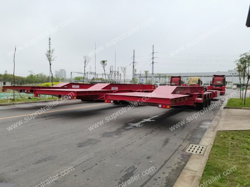 ❒Supro Trailer produces normal Extendable semi trailer for windmill blade transportation which can extend to be over 60m length. And also the trailer can be customized by Mechanical suspension, Air suspension and Hydraulic suspension. The steering modes of the long extendable semi trailer has Rometo controller model, Manual operation model and Following truck - automatic steering model. Compare with the long extendable semi trailer, the telescoping beam with hydraulic modular trailer still have below advantages:
