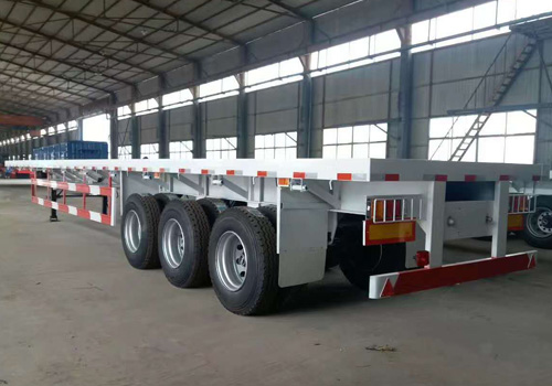 Principais Configurações do Reboque para Contêineres de 3 Eixos de 40 Pés 1. Estrutura: Reboque para contêineres de plataforma plana com 3 eixos de 40 pés. 2. Dimensões externas: 12500*2500*1560 mm 3. Pino rei: Pino de tração de 2.00'', tipo parafuso 4. Suspensão: Suspensão mecânica, design americano 5. Molas de aço: 6 conjuntos, 10 molas de lâmina 6. Pernas de apoio: 28 toneladas, operação manual (Jost pode ser uma opção) 7. Número de eixos / peso / marca: 3 eixos * 13T, marca FUWA (outras marcas podem ser uma opção) 8. Especificações dos pneus: 12 unidades de 1100R20-16, marca Triangle 9. Aros: 12 unidades de aro 8.0 10. Trava de contêiner: ...