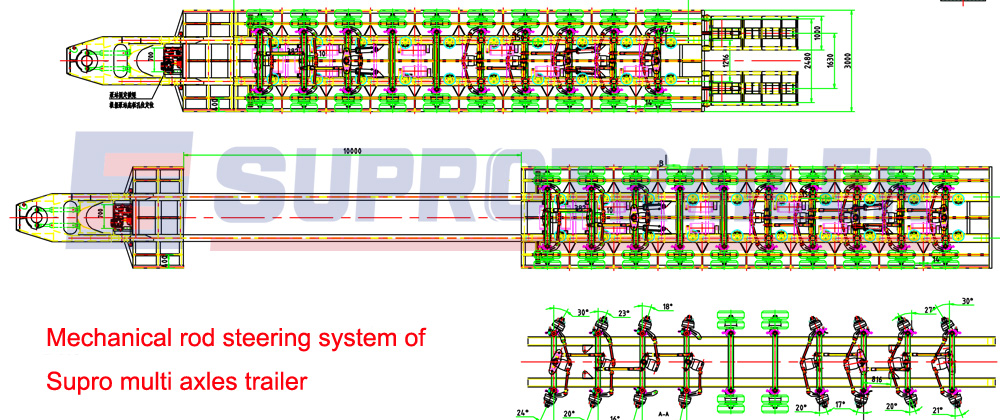 ❐Sobre o sistema de direção do nosso reboque de baixa altura de eixos múltiplos, podemos oferecer um sistema de direção por haste mecânica e eixos autodirigidos. A haste mecânica permite a direção automática seguindo o caminhão e é equipada com uma unidade de energia diesel independente para acionar os cilindros hidráulicos e realizar os movimentos de direção. Possui três medidas de direção: direção automática + direção por controle remoto + direção manual. O eixo autodirigido não requer a unidade de energia e realiza os movimentos de direção por meio de excentricidade.