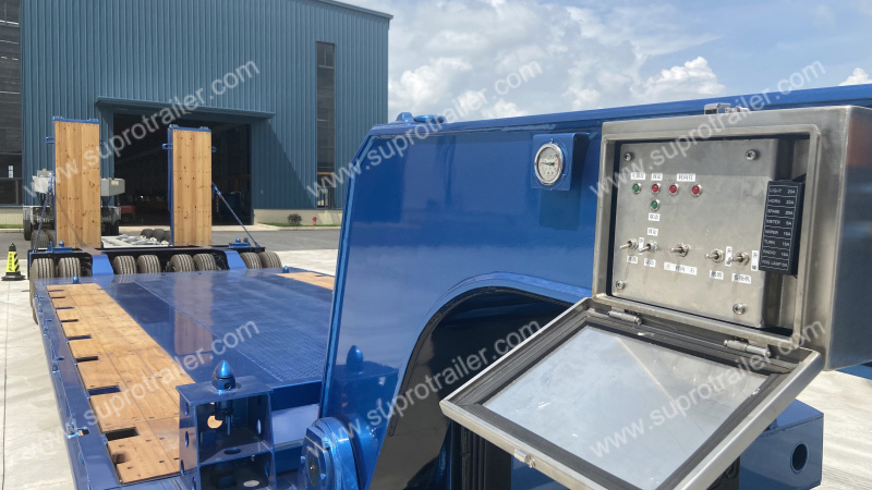 Supro Trailer produz reboques de cama baixa de padrão de alta qualidade para o mercado externo, e temos experiência no mercado japonês e sul-coreano. As exigências do mercado japonês são mais rigorosas do que os mercados europeus! Geralmente, o reboque especial de cama baixa de 1 linha - dois eixos utiliza suspensão mecânica fixa, mas a Supro personaliza o reboque de cama baixa de dois eixos com eixos de direção. Além disso, a Supro fez cuello de ganso elétrico para realizar a operação. Assim, somos a única fábrica na China que tem capacidade para personalizar o reboque de cama baixa especial.